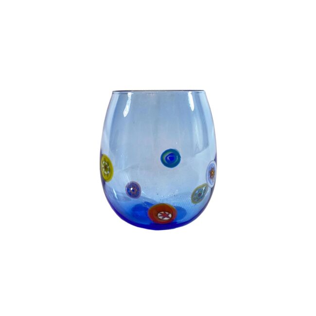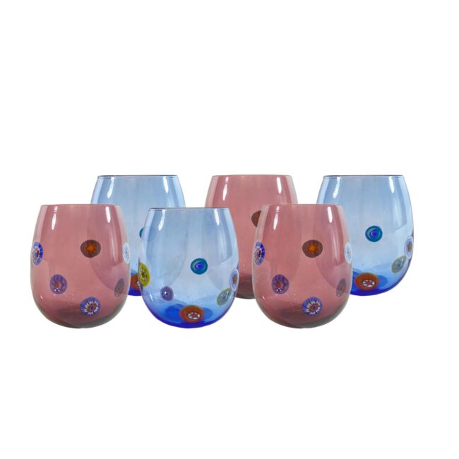 Set di 6 bicchieri artistici in vetro soffiato color ametista e bluino impreziositi da murrine millefiori realizzati a mano, secondo l’antica tecnica veneziana.