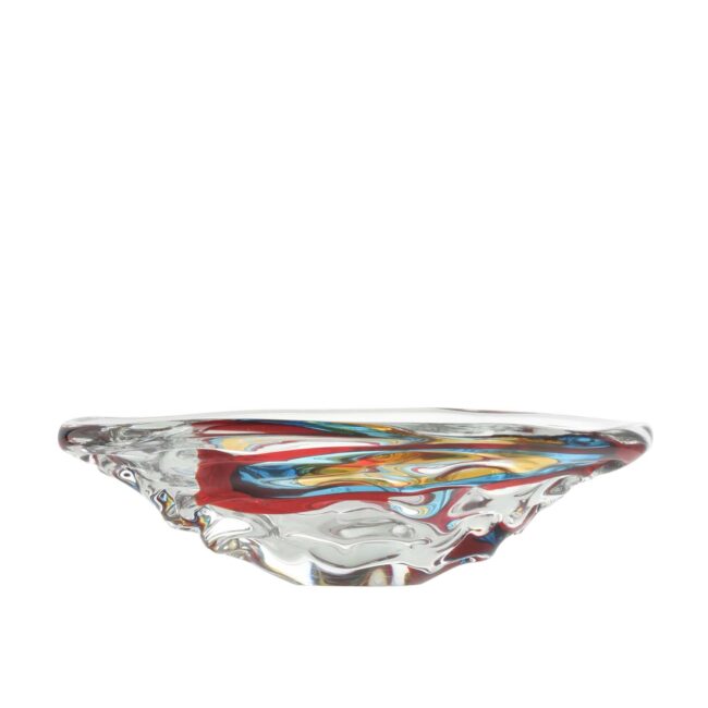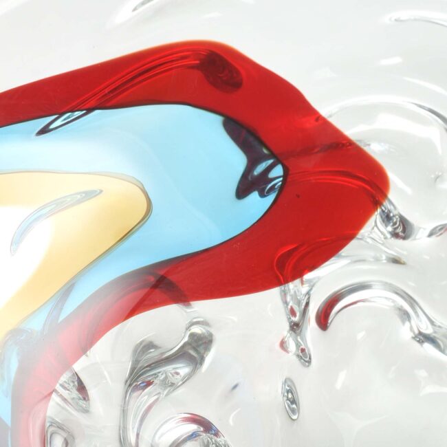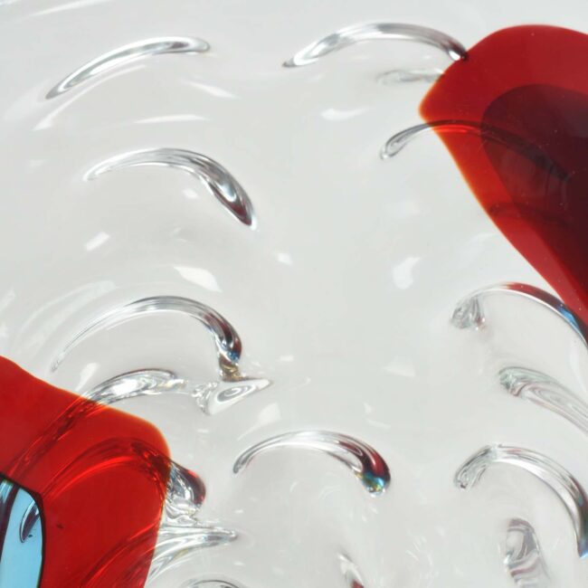 Centrotavola eseguito interamente a mano con effetto “wave” su disegno Signoretti. Lavorazione a 3 incalmi blu trasparente e acquamare.
