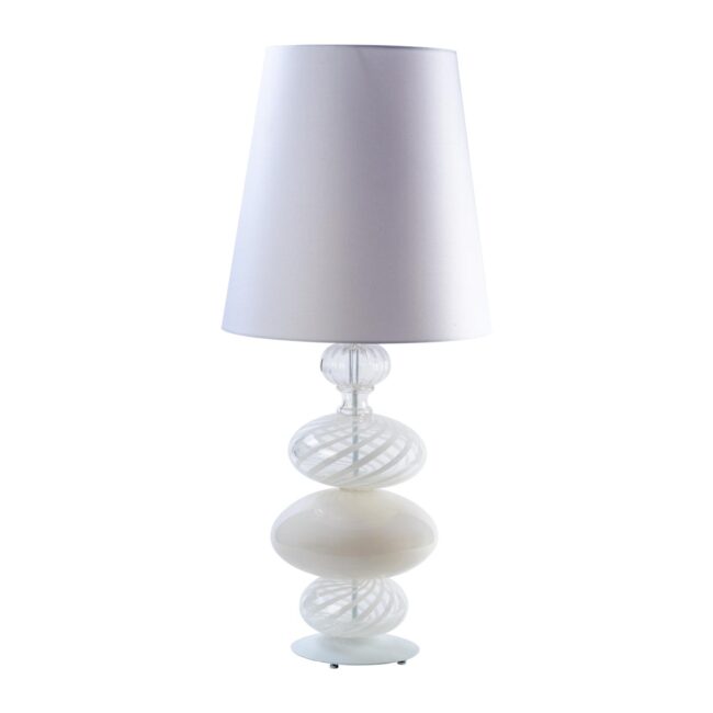 Lampada da tavolo realizzata a mano in vetro soffiato su disegno originale Signoretti. Lavorazione in filigrana con canna bianca secondo le antiche tecniche muranesi, paralume in tessuto bianco.
