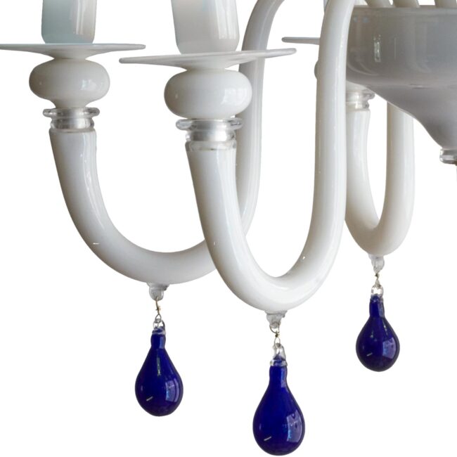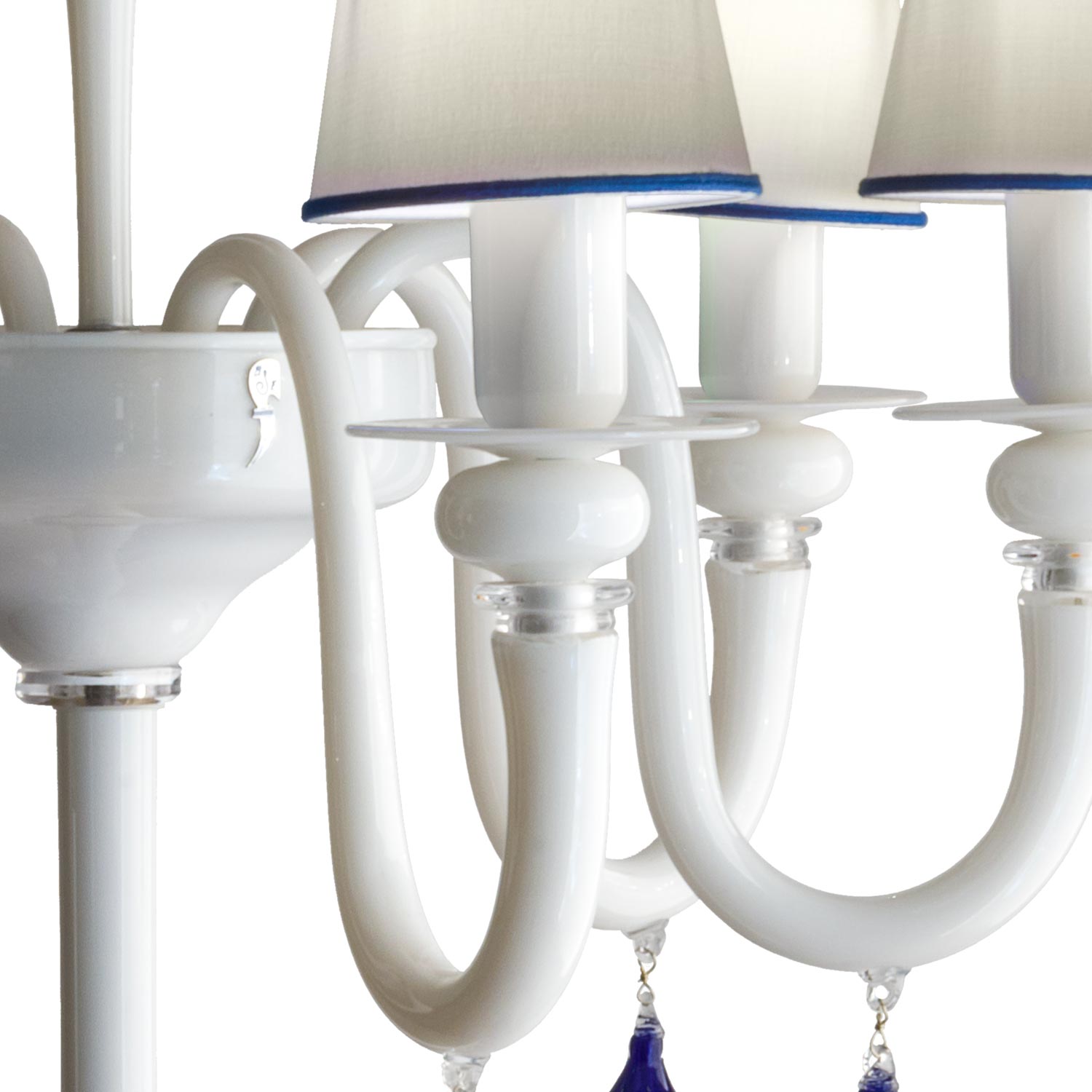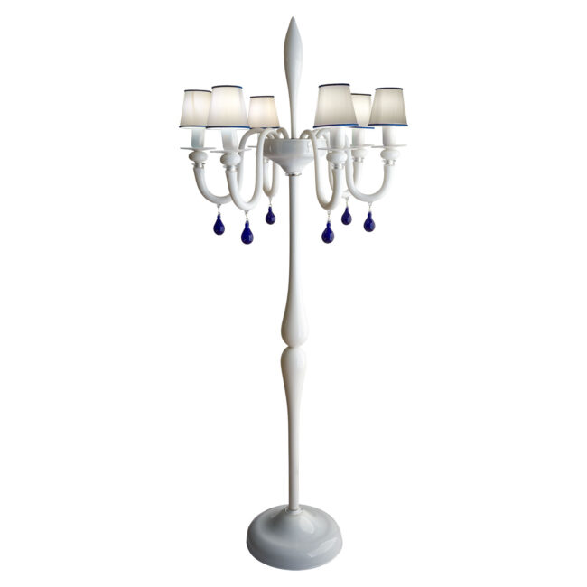 Piantana realizzata a mano in vetro di Murano colore bianco e pendenti blu. 6 luci con paralumi in tessuto bianco. Struttura lineare ed elegante.