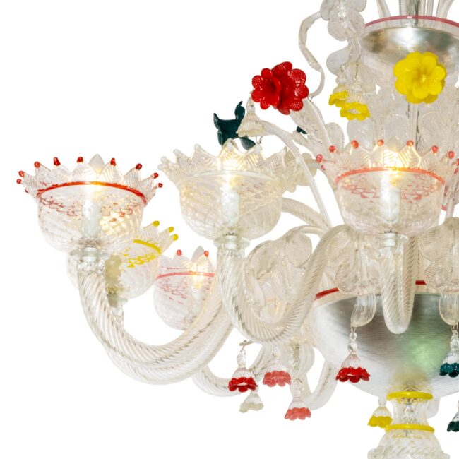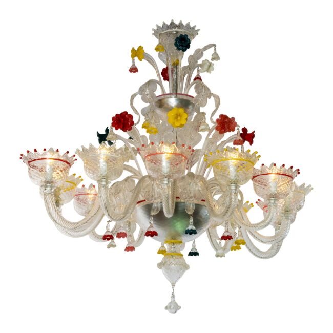 Lampadario in stile veneziano 12 LUCI realizzato su disegno Signoretti in color cristallo, fiori e decori in pasta colorata.