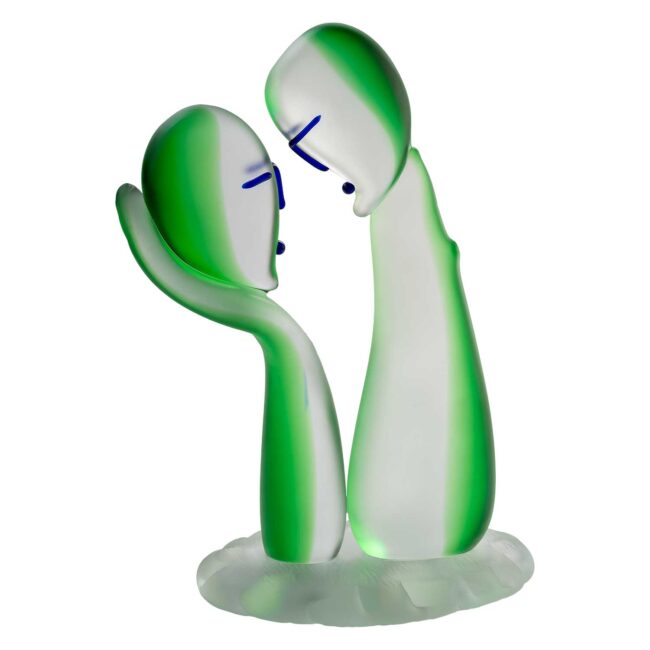 Scultura satinata in vetro a sbruffi giallo, verde con rifiniture acquamare e blu. Opera d’arte autentica eseguita a mano dal Team B.F. SIGNORETTI. Firma incisa a punta di diamante.