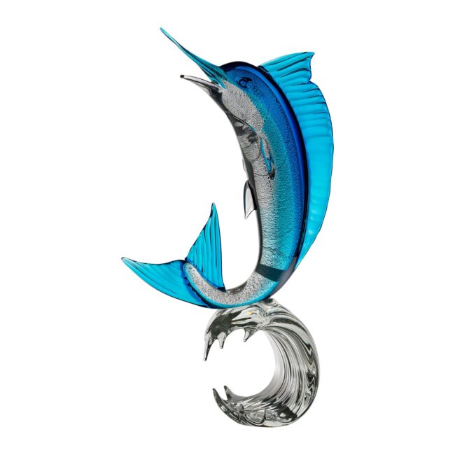 “MARLIN SU ONDA” capolavoro eseguito interamente a mano realizzato con la tecnica della modellazione del vetro a caldo color e acquamare; i minerali usati per ottenere, dopo molti tentativi, una particolare fusione del color acquamare e cristallo , la trasparenza della scultura, la luce che riflette; le ore dedicate alla creazione ed alla forma della scultura. Il Certificato di Autenticità che accompagna l’opera ne comprova ulteriormente l’originalità e l’altissima qualità.