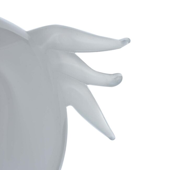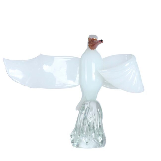 Pellicano bianco con ali aperte su base trasparente. Opera realizzata interamente a mano su disegno Signoretti ed è accompagnata dal certificato di autenticità.