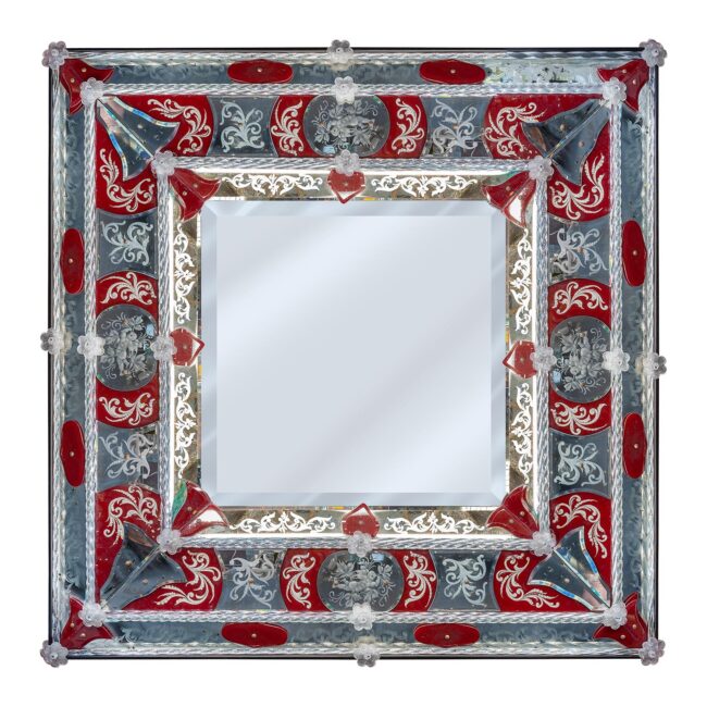 Struttura in legno massello, specchio quadrato in vetro bisellato argentato molato e inciso a mano. Decorato con ritagli di vetro color rosso e rifinito con canne torchon e rosette in vetro cristallo.