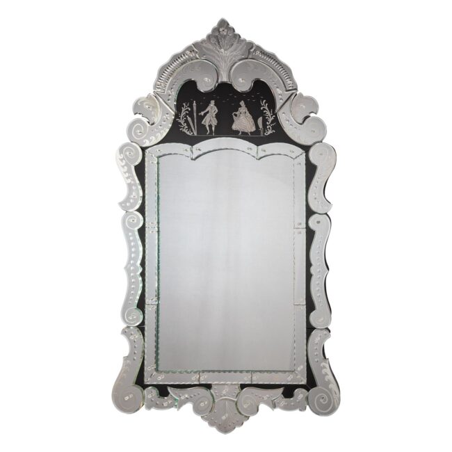 Struttura in legno intagliato, specchio molato composto da lingue e ritagli di vetro a specchio in vetro cristallo con incisione dama e cavaliere sul cimiero. Eseguito a mano dai nostri Maestri Vetrai.