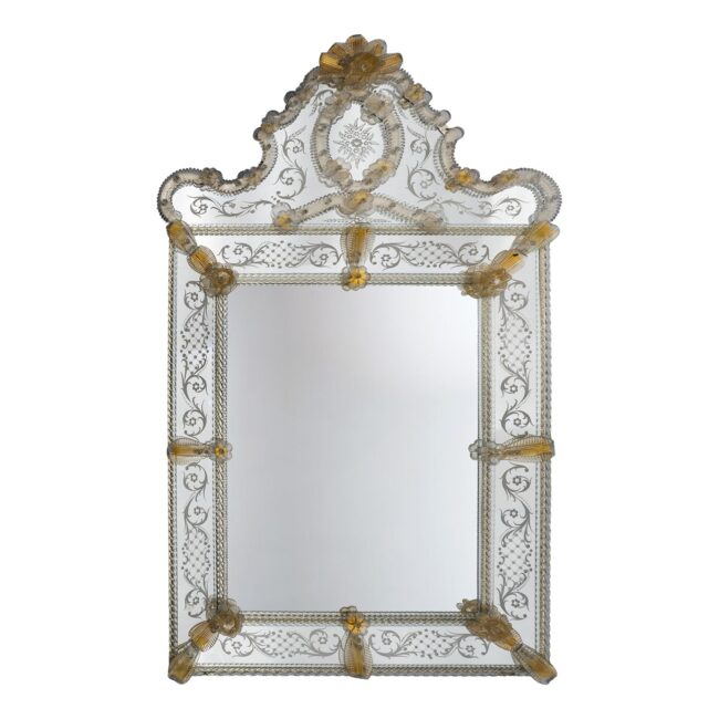 Struttura in legno massello, specchio rettangolare in vetro bisellato, cornici e cimiero incise, ricci, foglie e rosette in vetro cristallo e oro; rifiniture con canne torchon.