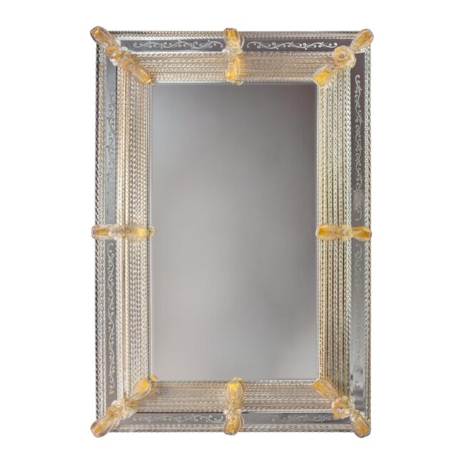 Struttura in legno massello, specchio rettangolare in vetro bisellato con cornici in vetro inciso, con foglie, rosette e canne torchon in vetro di Murano color cristallo e oro.