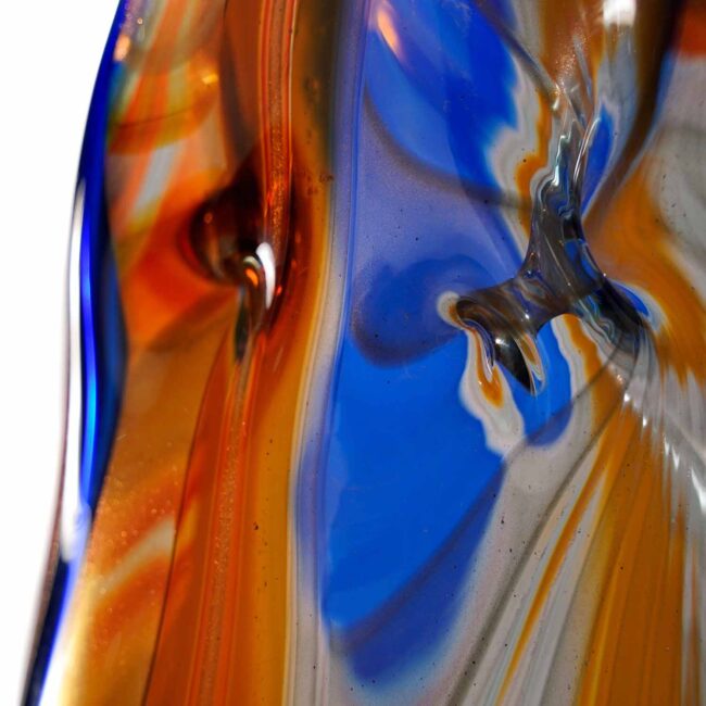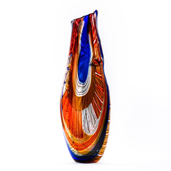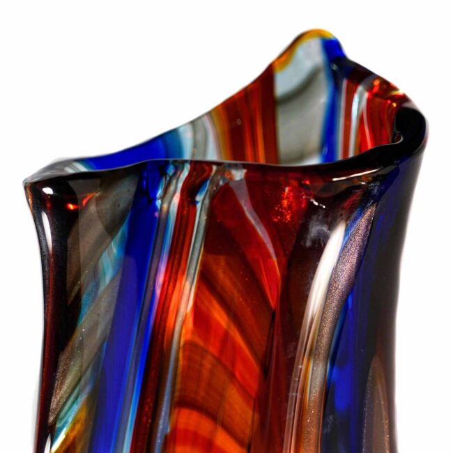 Vaso in vetro artistico di Murano eseguito interamente a mano con canne multicolore in pasta vitrea. Opera d’arte autentica eseguita a mano dal Art Team. Firma incisa a punta di diamante.