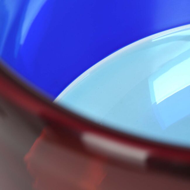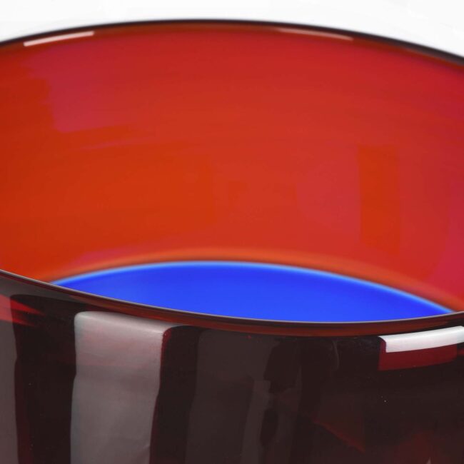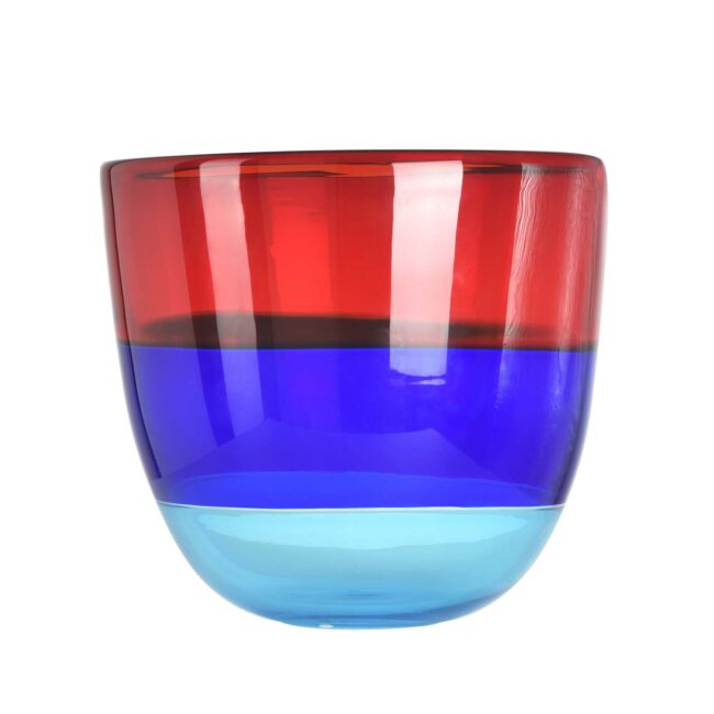 Vaso a forma ovale eseguito interamente a mano con tecnica a tre incalmi rosso, acquamare e blu su disegno Signoretti.