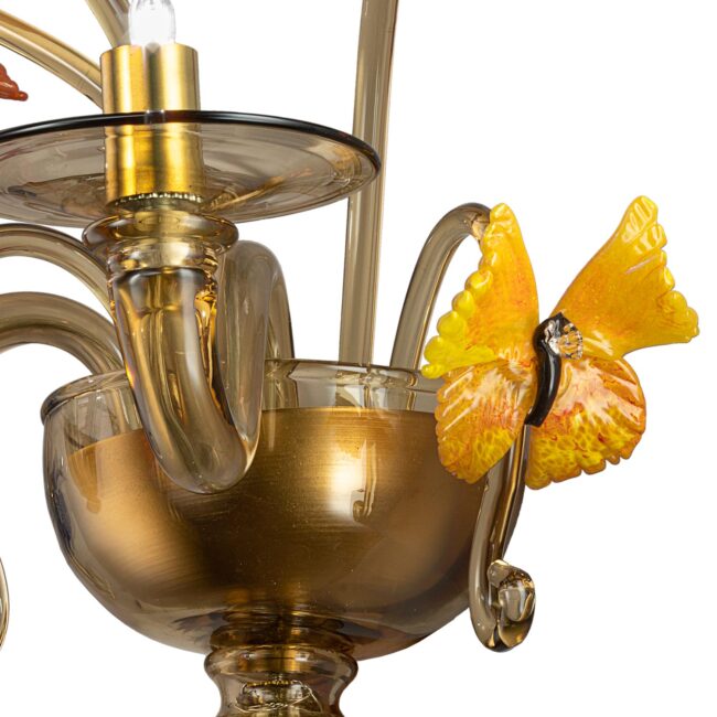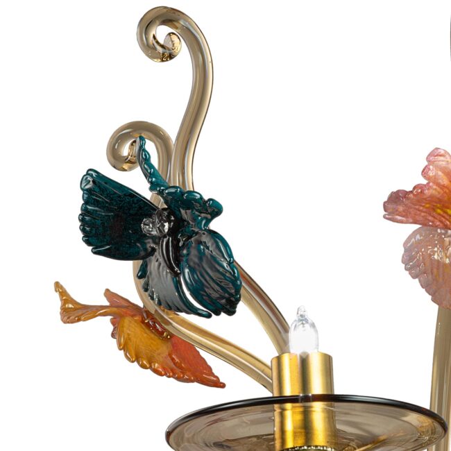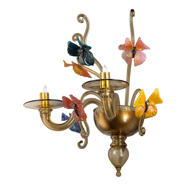 2-light wall sconce, smoky glass color, LED lighting and butterflies decoration entirely hand-made based on the original Signoretti design, hot attached with an elegant and precise mastery to the upward and downward curls.