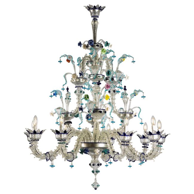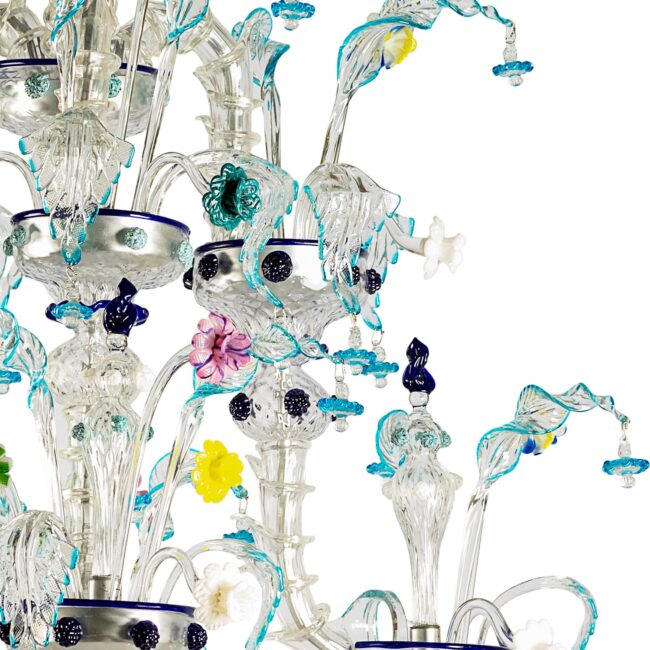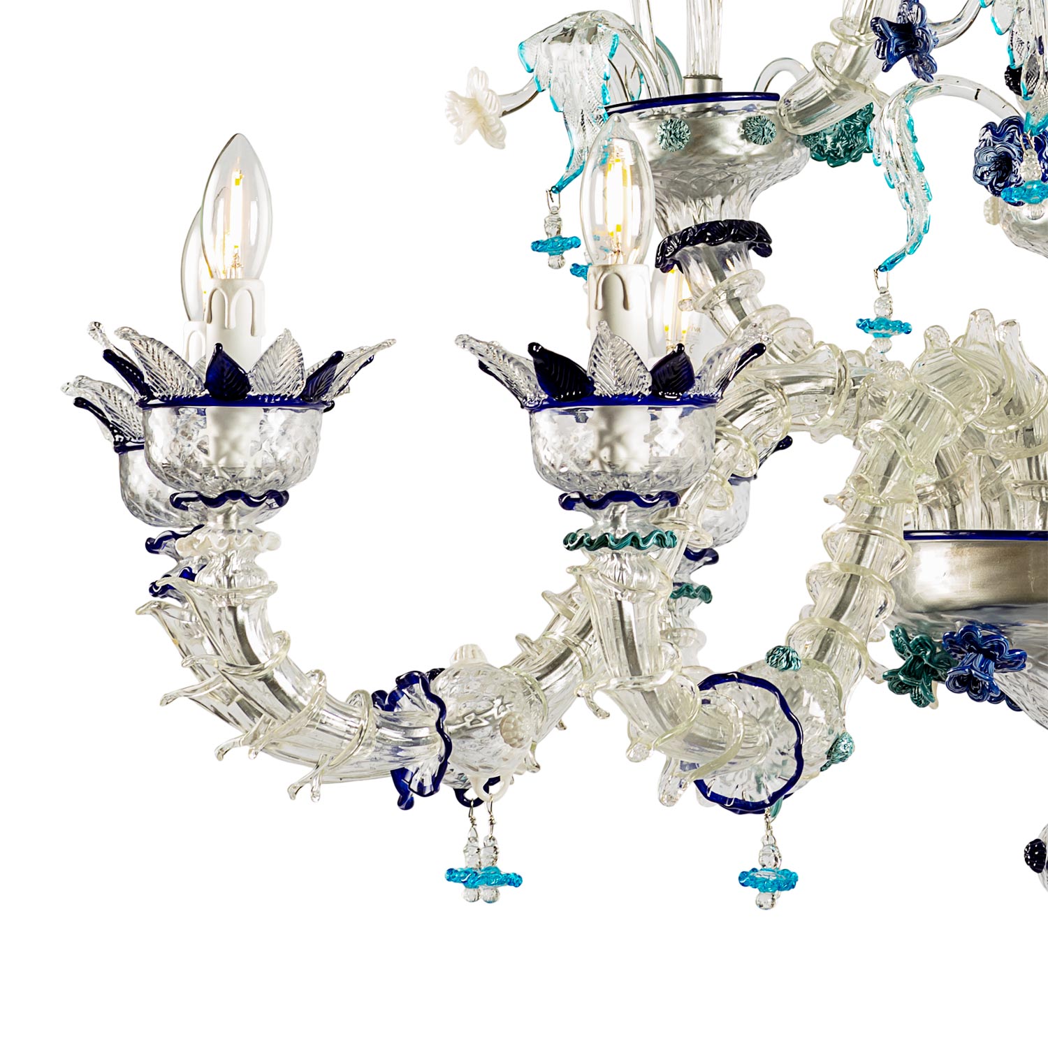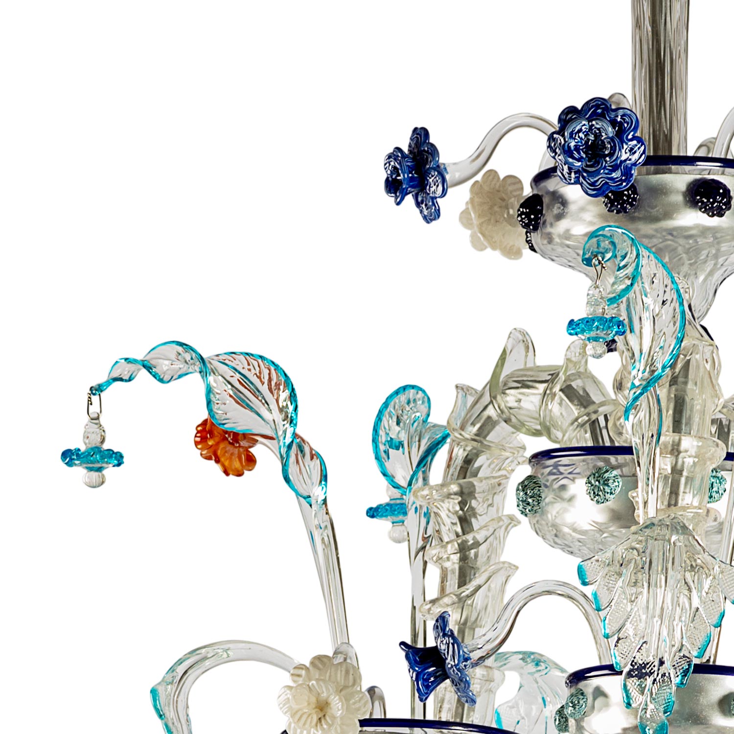 Prestigious XVIII century Rezzonico style 9 light-chandelier entirely handmade on original Signoretti design in transparent crystal color, blue and aquamarine rim, polychrome flowers in glass paste.