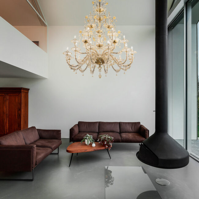 Rezzonico style 12+6 light chandelier in crystal and golden decoration. The prestigious chandelier is made up of many elements. Entirely handmade with arms covered with small cylinders and pendants.