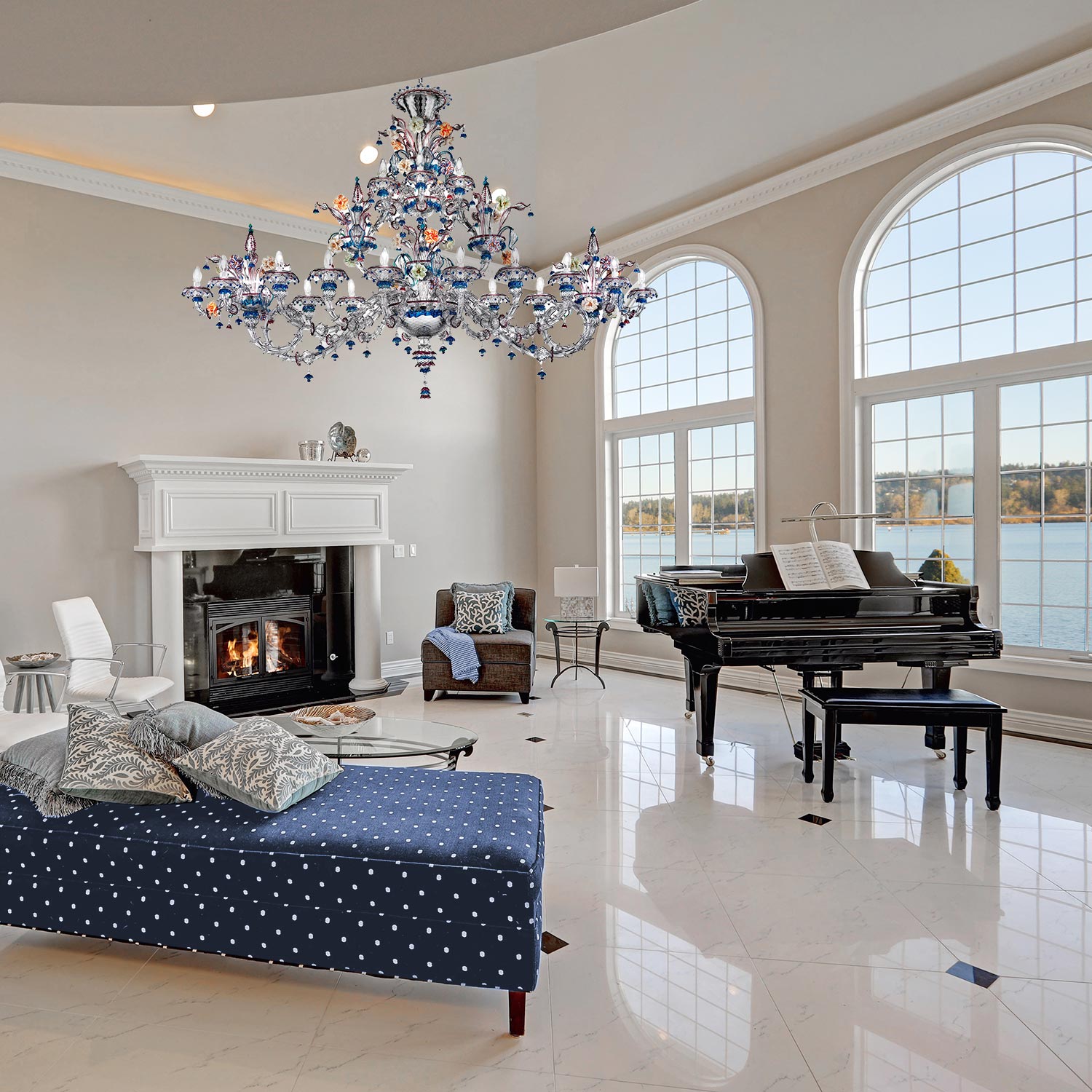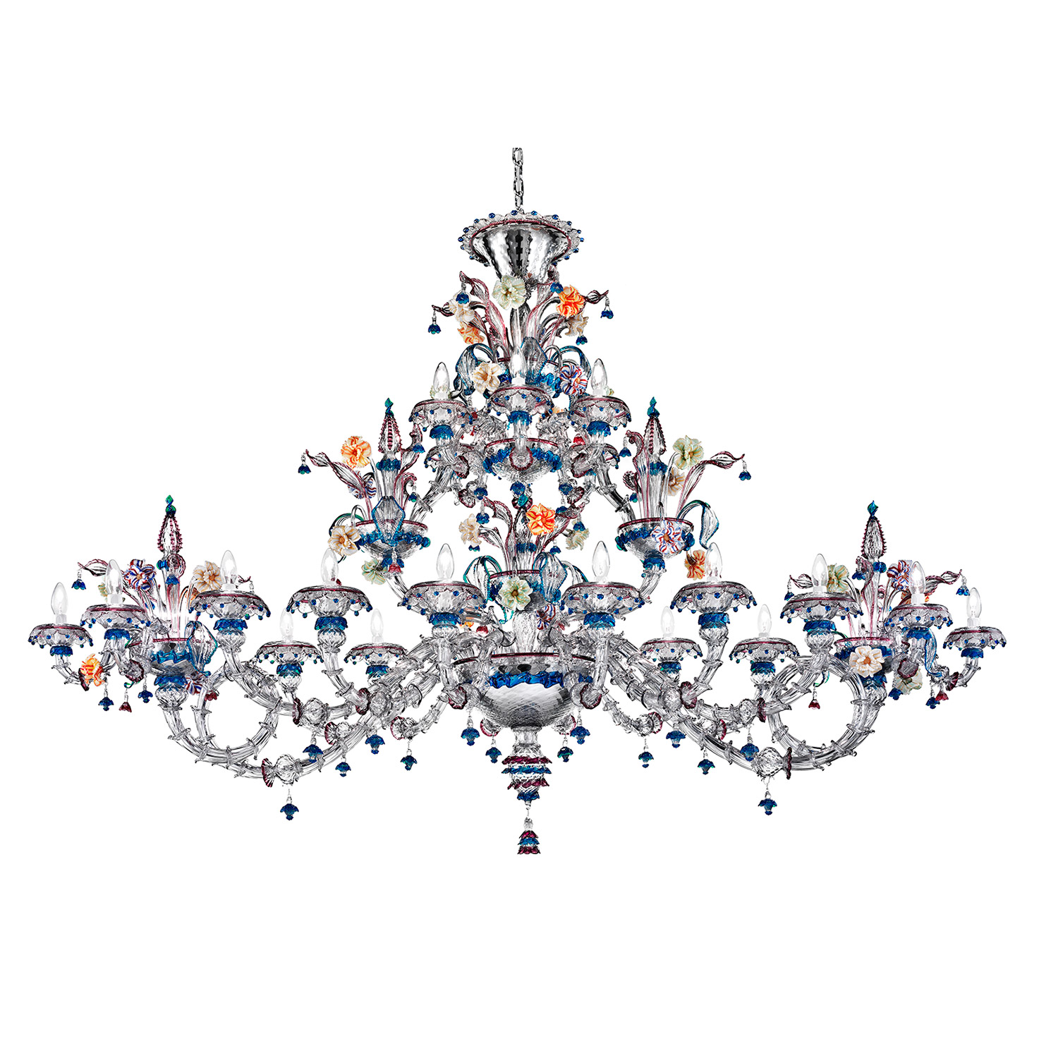 Rezzonico style 18+6 light chandelier in crystal color and aquamarine and red decoration with flowers in colored paste.