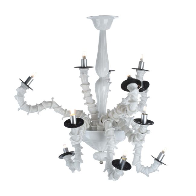 12-light Rezzonico style chandelier in white modern glass with black flat cups entirely handmade on Signoretti design.