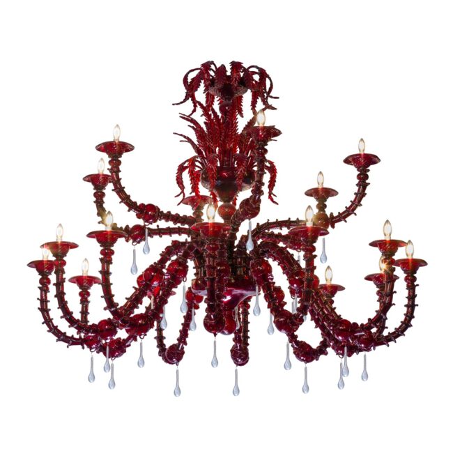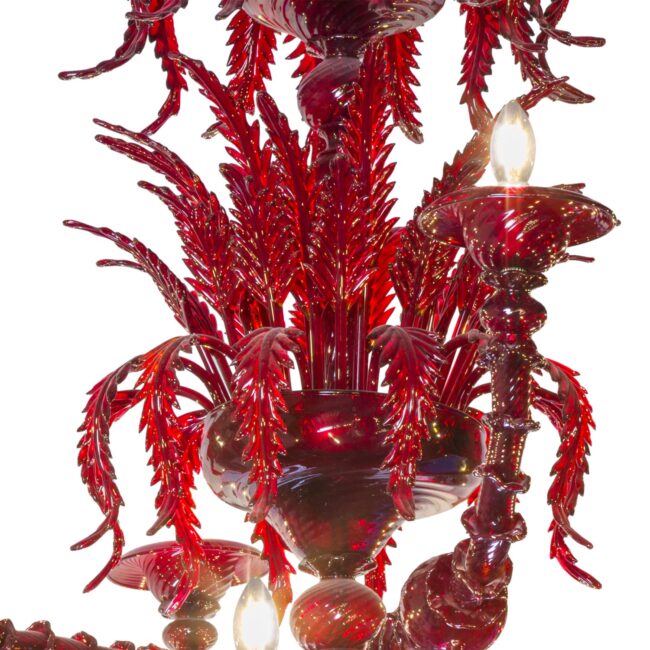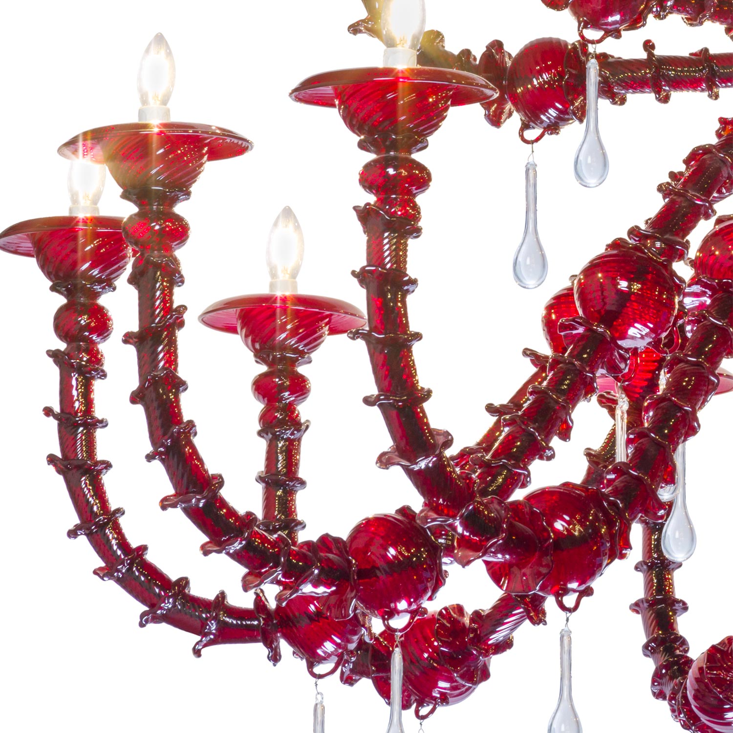 Elegant and prestigious 12-light Rezzonico style chandelier made entirely by hand, in red color, elliptically shaped, the wide arms made up of many small red cylinders, two crests covered with upward leaves and a passion red base.
