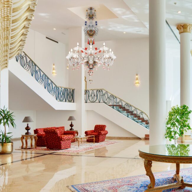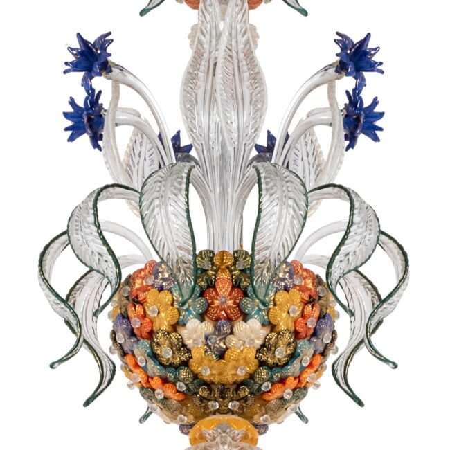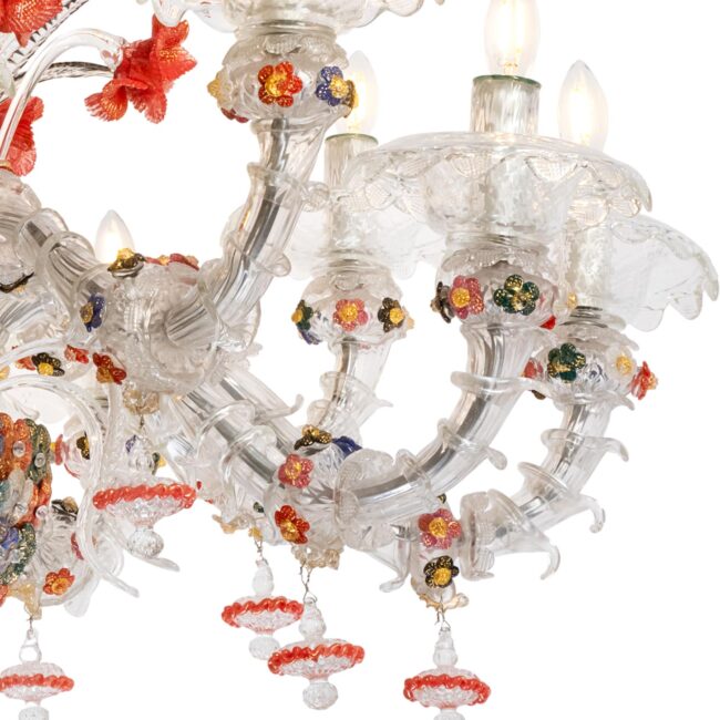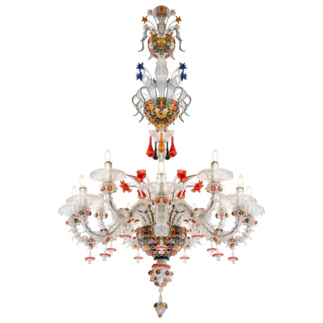 Prestigious Rezzonico style 18- light chandelier (12 + 6) made entirely by hand on the original Signoretti design; many small cylinders cover the wide arms, the central part is composed of 3 wooden bottoms covered with an explosion of colored rosettes, enriched with upward flowers and other colored decorative elements with pendants.