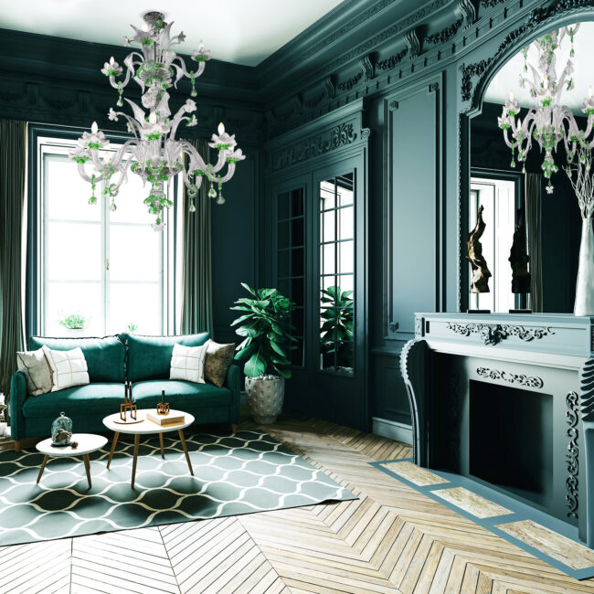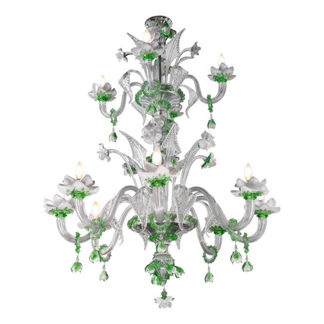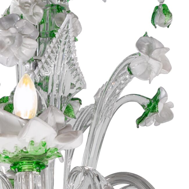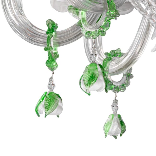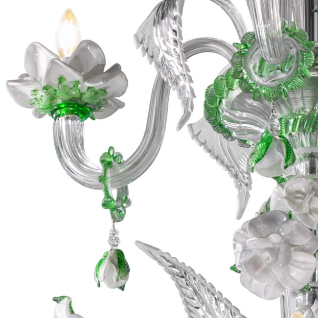 8 + 4-lights chandelier on original Signoretti design, in crystal color with white roses and green decoration in Venetian style with flowers and leaves, pendants on the arms.