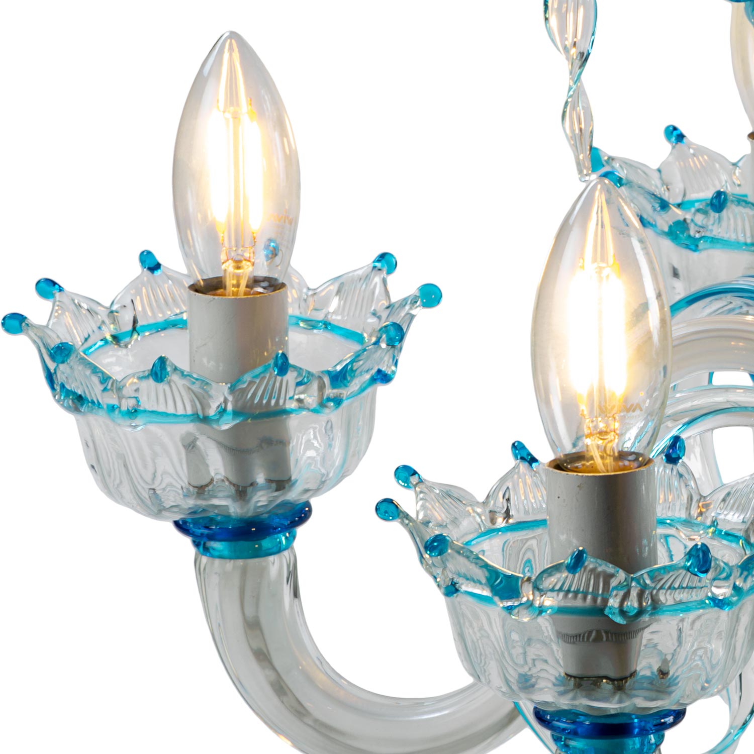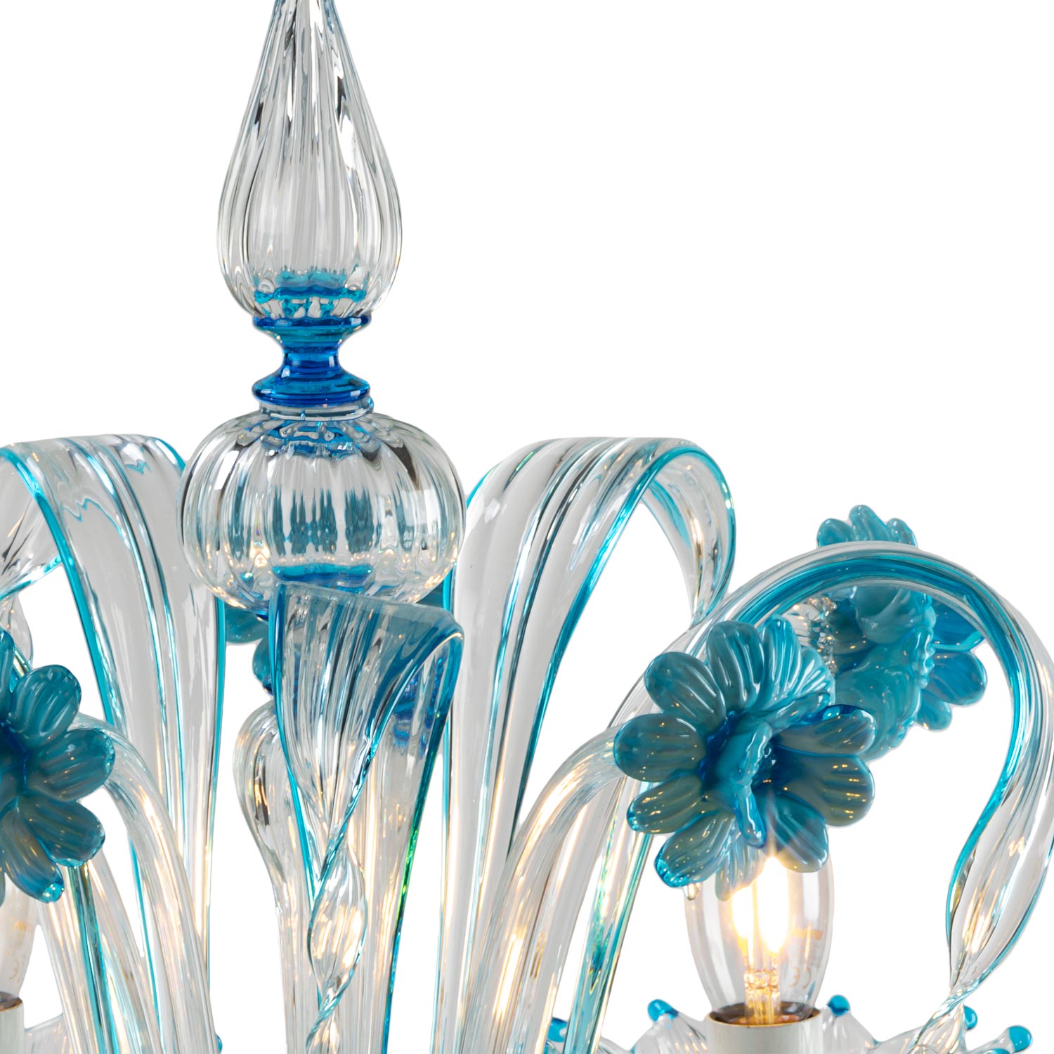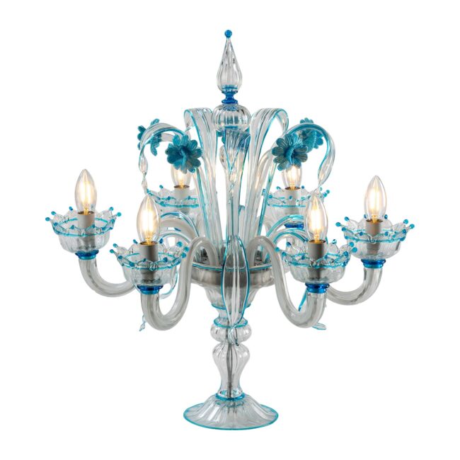 Venetian style 6-light table lamp in crystal and aquamarine color with upward and downward leaves and paste flowers.