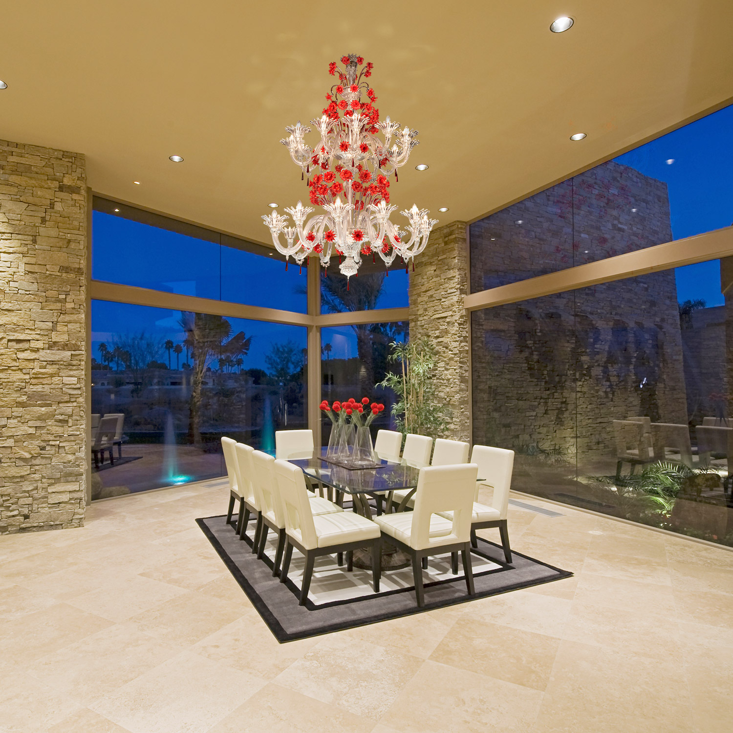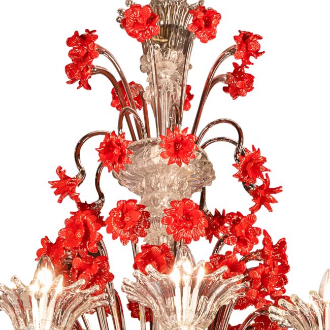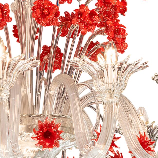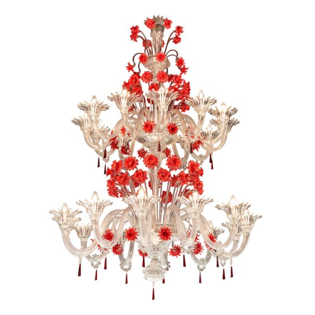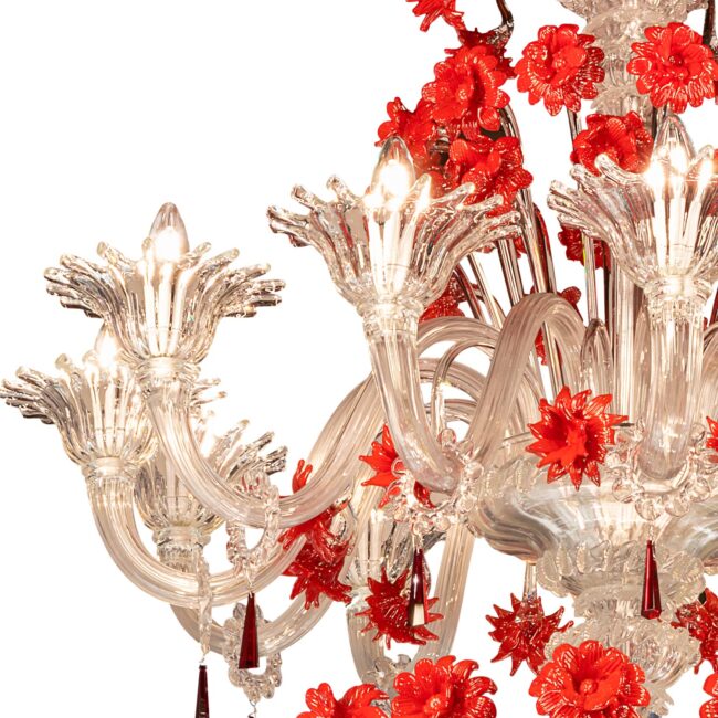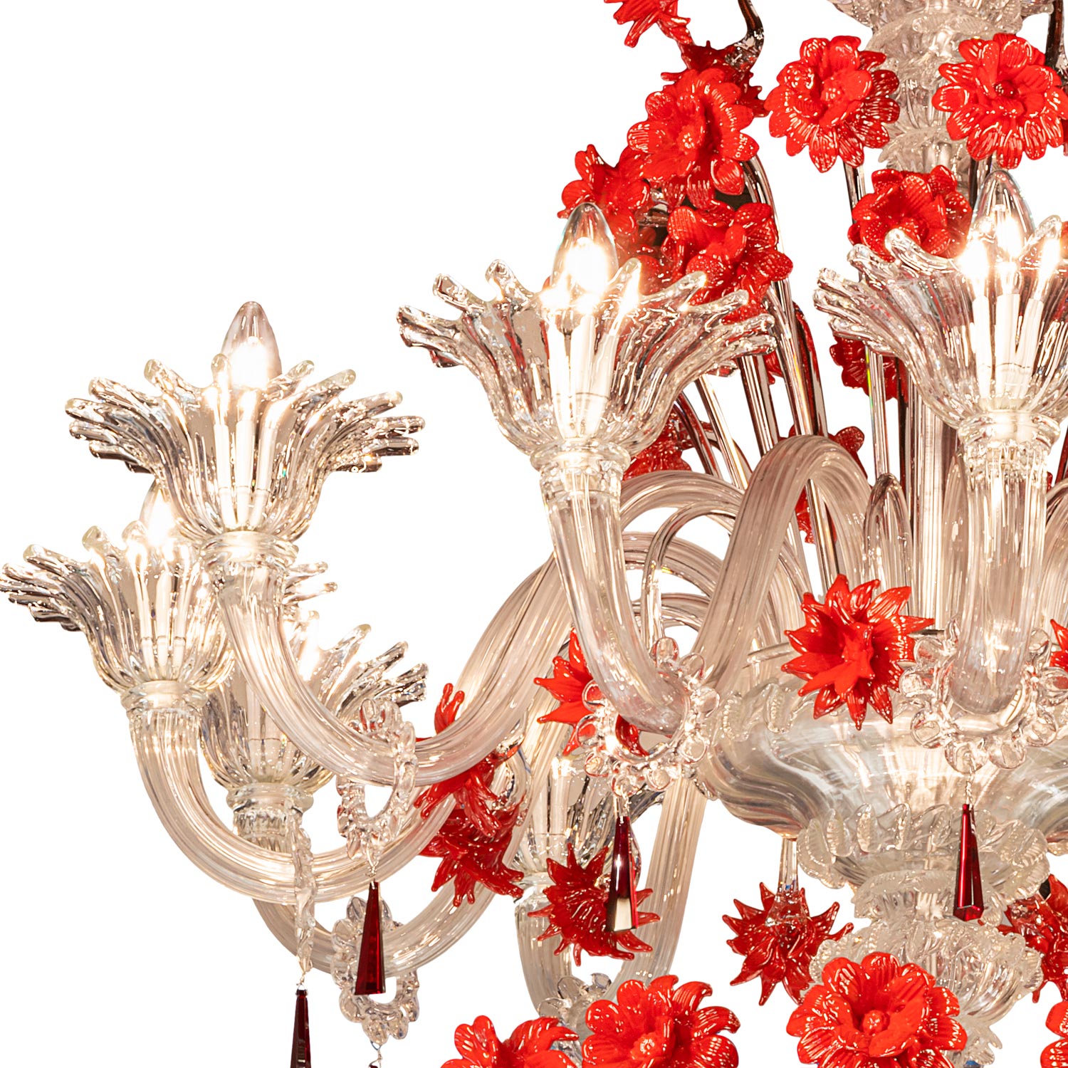 12+12-light Venetian style chandelier made on original design in crystal color and red paste flowers; developed on two tiers with a triumph of red roses and pendants.