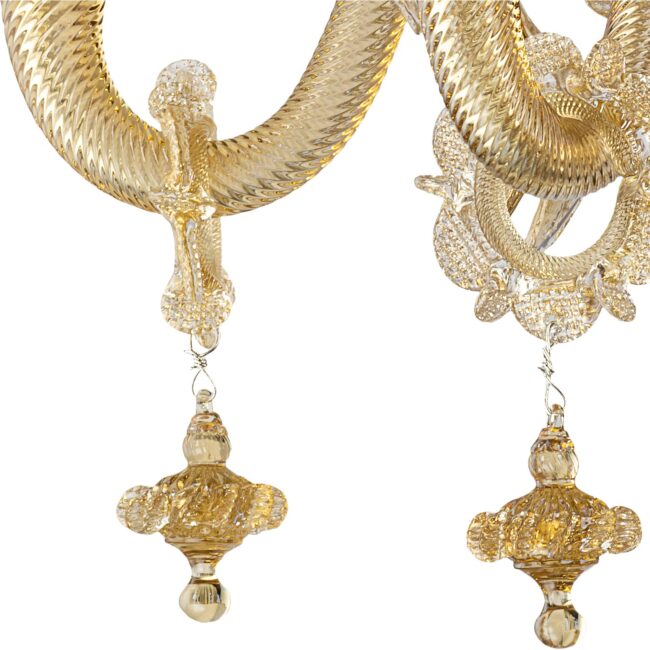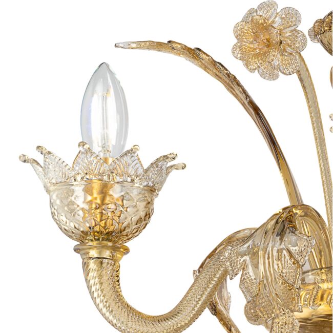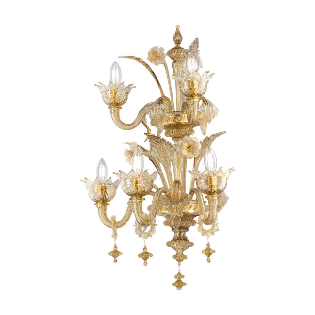 Double tier 3+2-light wall sconce in smoky color and golden decoration with flowers, leaves and pendants.