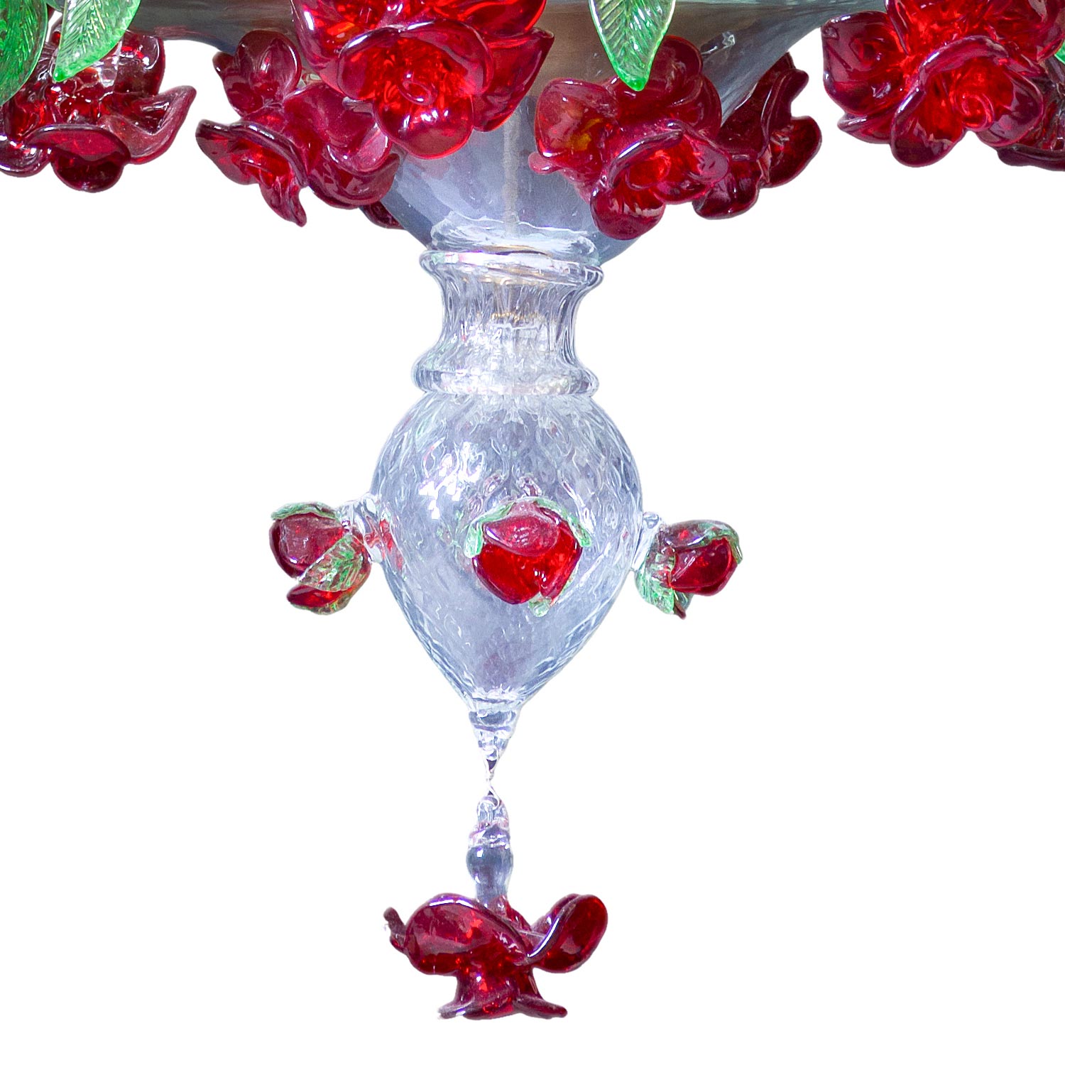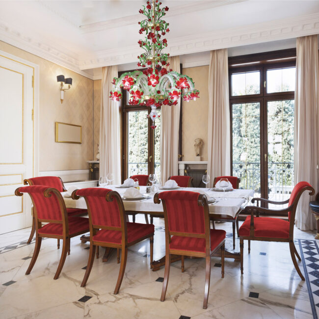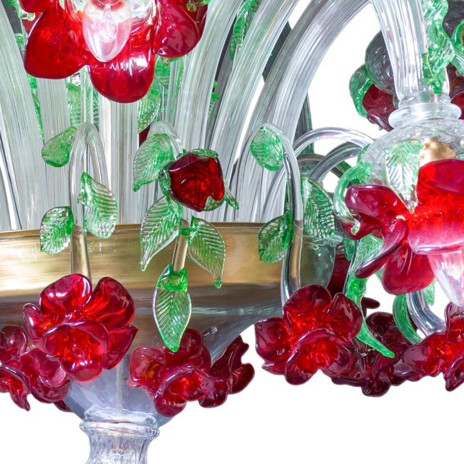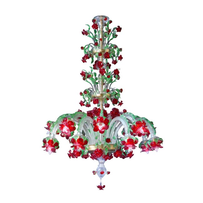16-light Venetian style chandelier in crystal, red and green color made on Signoretti design alternating arms on the central tier and two crests with a triumph of roses in red paste and decoration with green leaves.