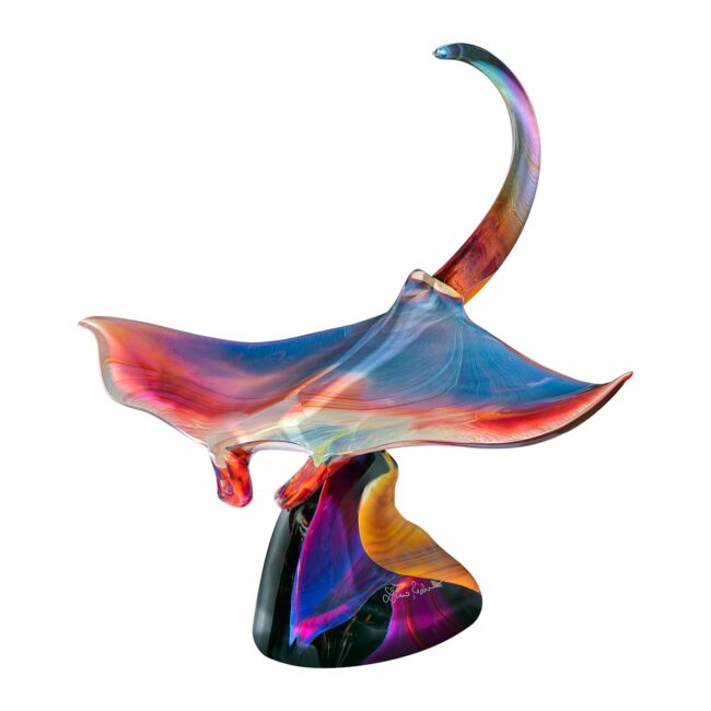 “MANTA” masterpiece entirely handmade in chalcedony working process which is a type of glass that echoes the multicolored striations of the zoned agate, The colors, shades and markings of the mysterious calcedonia result from a chemical process intrinsic to each batch of glass; a reaction based on the effect of the metal silver on the other minerals and substances used to make glass. Each piece is unrepeatable as the calcedonia effect varies time by time and it is therefore never the same; The primary work of art has been carefully selected by our Master glassmaker; his glass seal guarantee the correct manufacturing of his masterpiece. Each glass art piece comes with the Certificate of Authenticity